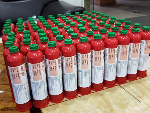 用于SMT贴片,为防止即PCB板上的元器件在过锡炉时脱落而需提前用红胶固定元器件,此胶水需冷冻贮存于冰箱里。